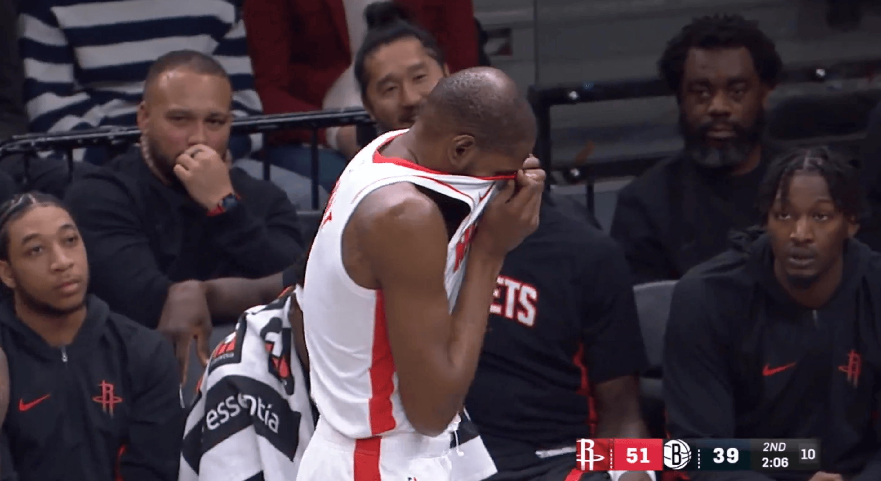 比赛中,篮网球员沃尔夫三不沾后,篮球砸到杜兰特的脸上,杜兰特随即脱口而出一句: