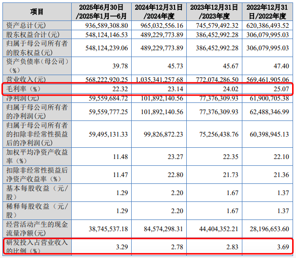 然而,业绩增长背后,拓普泰克毛利率却连续下降,报告期内分别为25.07%、24.02%、23.14%、22.32%。与此同时,研发投入占营业收入的比例也呈现整体下滑趋势,报告期内分别为3.69%、2.83%、2.78%、3.29%。