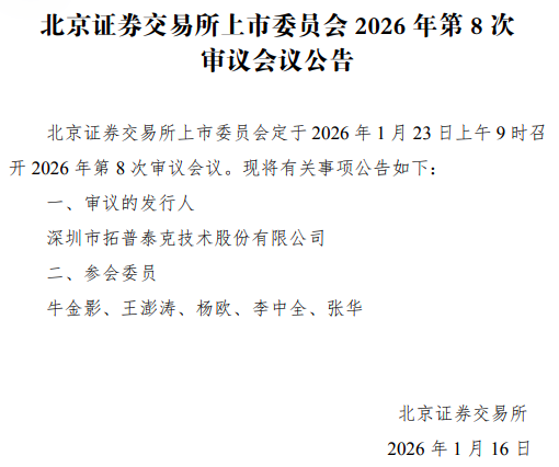 1月16日,北交所发布公告,北京证券交易所上市委员会定于2026年1月23日上午9时召开2026年第8次审议会议,审议深圳市拓普泰克技术股份有限公司(以下简称“拓普泰克”)的上市申请。