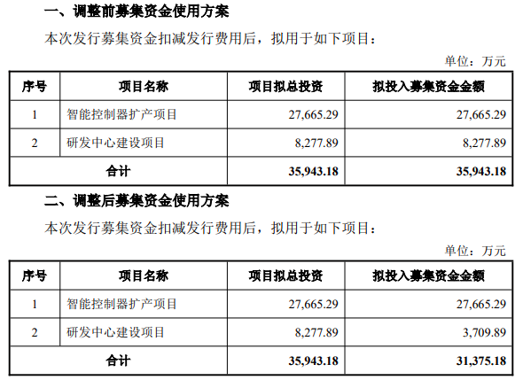 记者注意到,据招股书申报稿,拓普泰克本次IPO拟募集资金3.59亿元,用于智能控制器扩产项目和研发中心建设项目,而根据1月16日最新公告,拓普泰克将拟募集用于研发中心建设项目金额由8277.89万元大幅减少至3709.89万元,降幅为55%,因此本次拟投入募集资金金额预计降至3.14亿元。